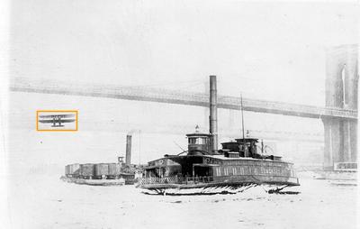 Frank Coffyn flying under the Brooklyn Bridge, New York, 1912.