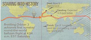 The route of the Breitling Orbiter 3 on its record- setting round-the-world balloon flight.