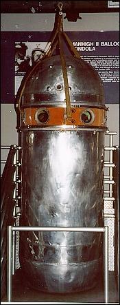 The gondola on Manhigh II. This pressurized capsule was used by Major Simons on his 32-hour flight to 101,516 feet. With the pilot and equipment aboard, the total weight of the gondola was 1,648 pounds.