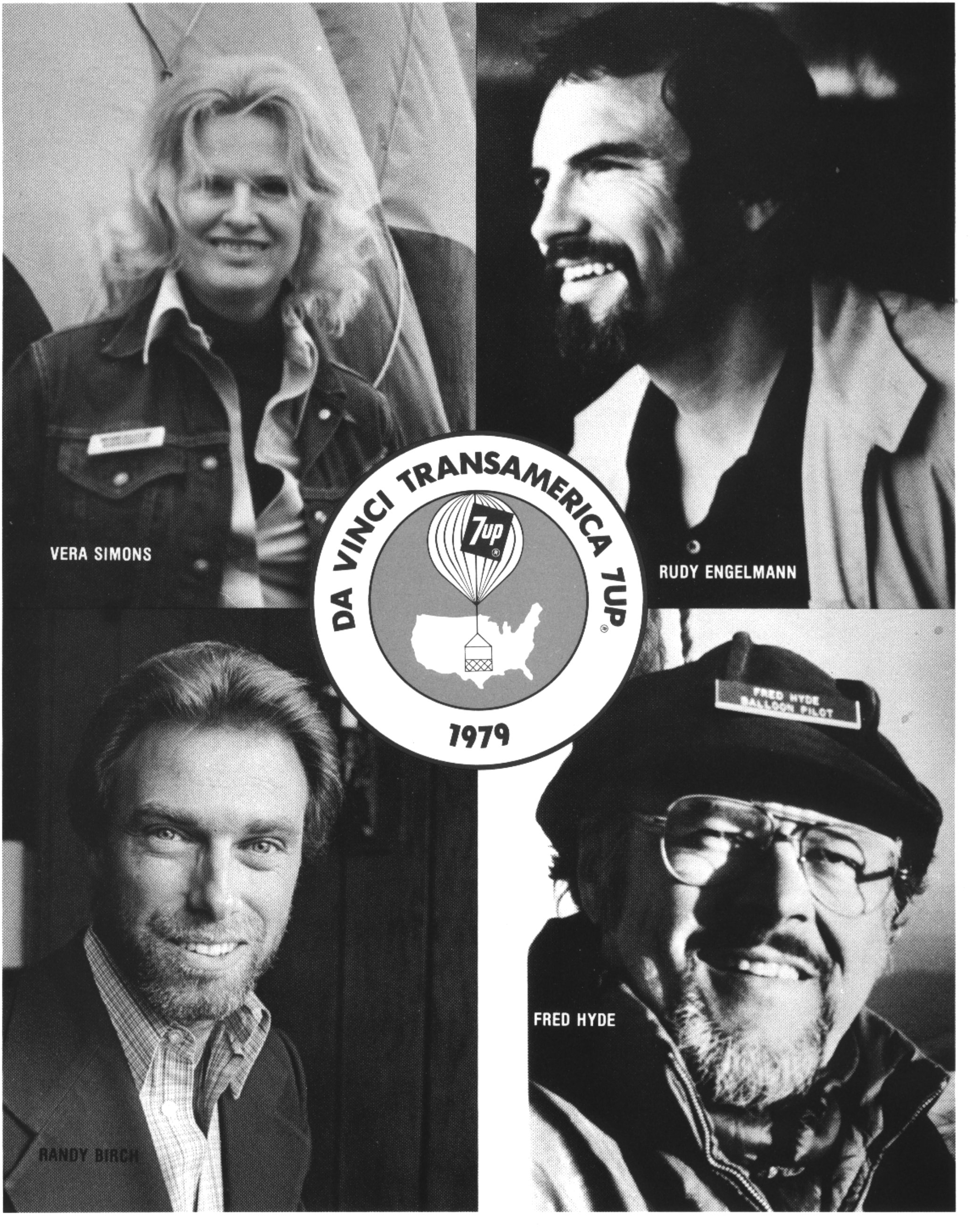 The crew of daVinci Transamerica: top row (left to right) Vera Simons, Rudy Engelmann, bottom row (left to right) Randy Birch, and Fred Hyde. The flight was sponsored by 7-Up. [ Larger Image ] Credits - Vera Simons