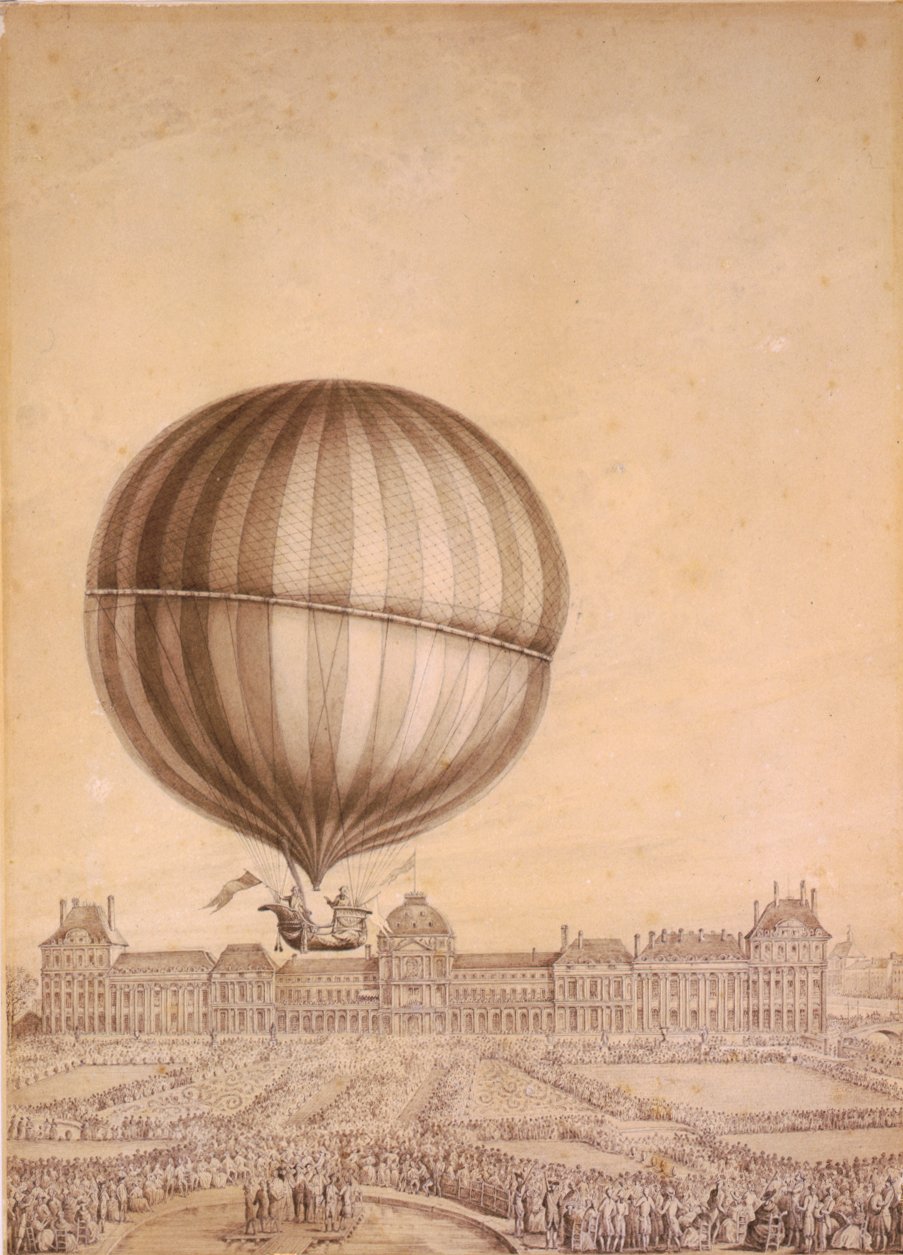 Departure of Jacques Charles and M.S. Robert's aerostatic globe from the Jardin des Tuileries on December 1, 1783. [larger image]
