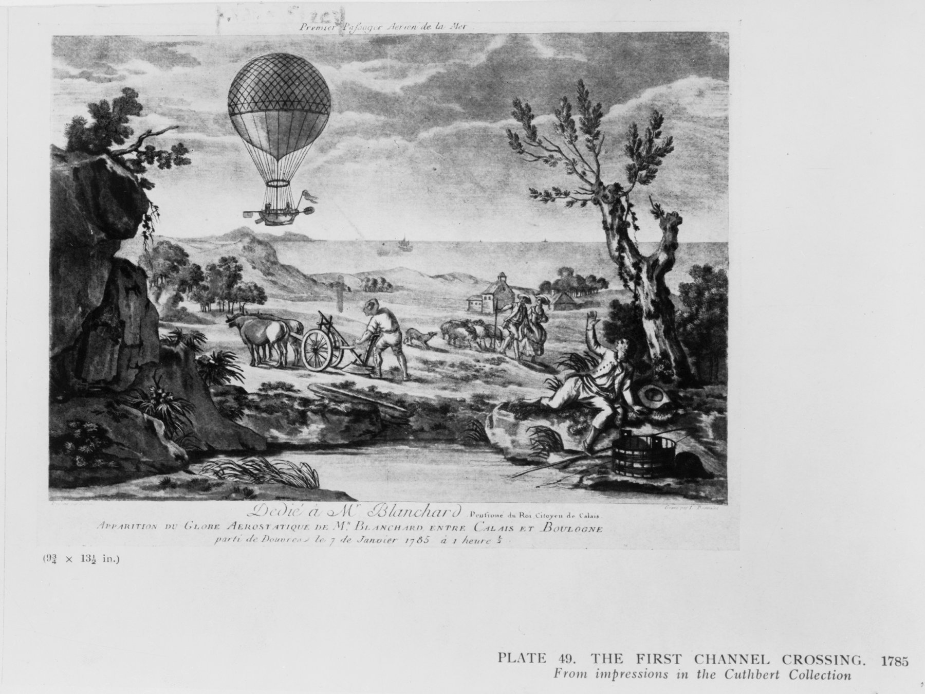 Blanchard's balloon flying over France after completing the first balloon crossing of the English Channel, 1785. [larger image]