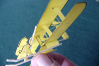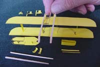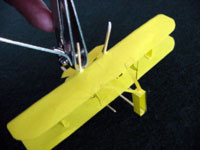 - Smear glue lightly on the wing strut feet. The bottom wing assembly should be lined up carefully, and lowered gently in position using the tail support toothpick as shown. It should be directly above the upper wing.