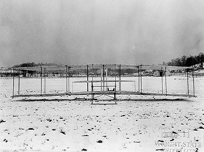 These pictures are the most clear illustration of the revolutionary control system developed by the Wrights. They were used as evidence by Orville in the patent trails of the 1920s. (Crouch, p. 497) Note how the warping occurs only in the outer sections of the wings. The center section was braced to remain in a fixed position to provide a stable support for the engine and transmission. The spars running the length were hinged to allow the outer parts of the wing to move. | ||