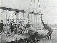 This image comes from a film shot in 1908 depicting Wilbur Wright starting a Wright Model A in France. It is a silent film.
